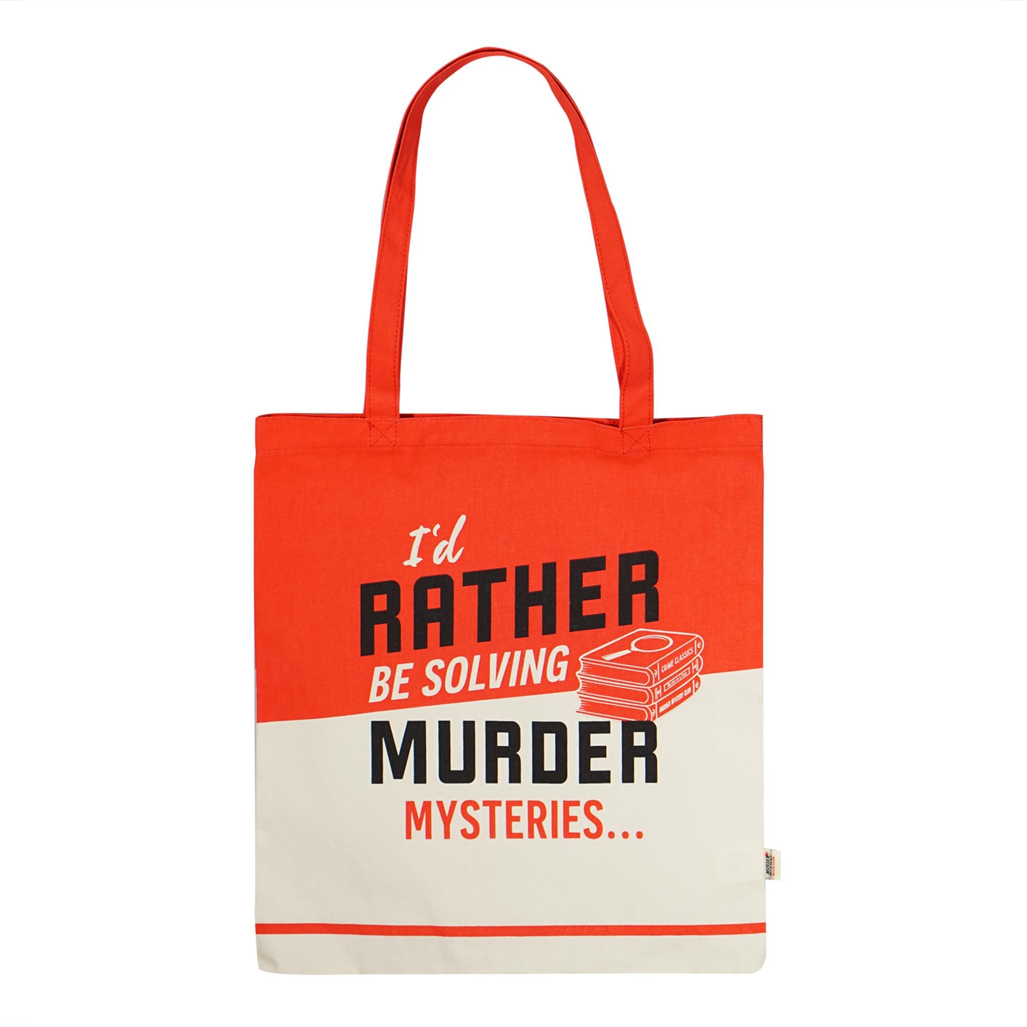 Designed in house, this recycled cotton shopper features graphic, text led artwork inspired by the murder mystery genre in a bold red colourway. Practical and reusable, it delivers strong visual impact while remaining suitable for everyday use.