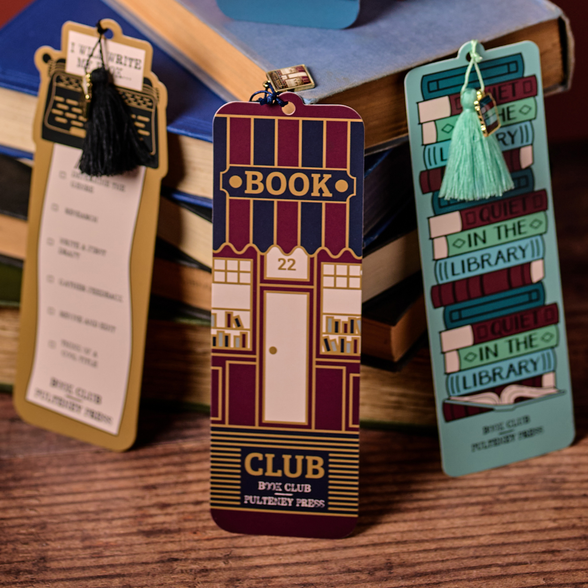 Inspired by book clubs and library culture, this paper bookmark features graphic, text led design in a classic dark colour palette, finished with a coordinating charm and tassel. A decorative and practical addition to book and gift ranges.