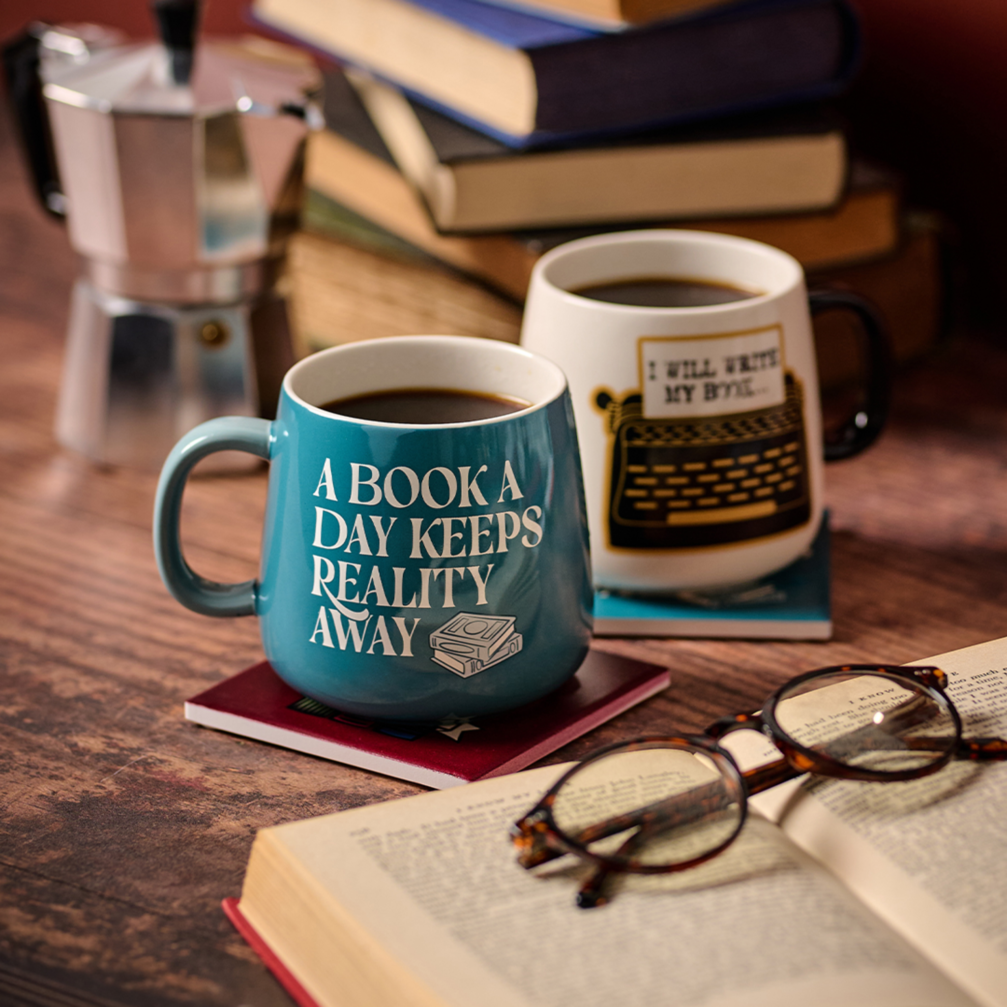 Designed in house, our oval mug features book lover typography and graphic design in a rich, dark colour palette. Suitable for everyday use, it offers a practical homeware piece with strong literary character.